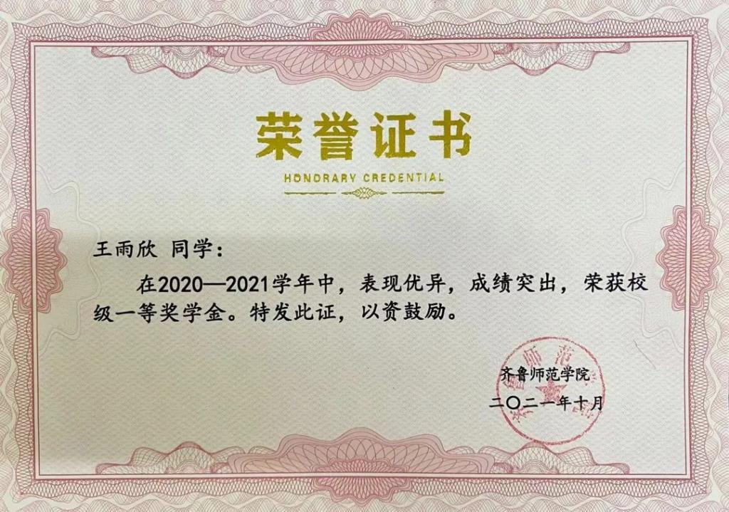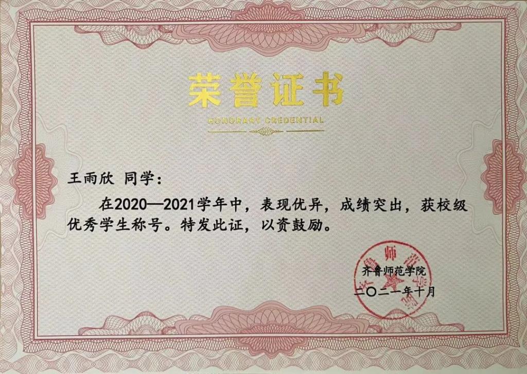 王雨欣入校以来,认真踏实,学习勤奋,自觉性强,在学习上勤奋刻苦,于2020-2021学年取得第一名,获得校级一等奖学金、校级优秀学生;于2021-2022学年度取得第二名,获得校级二等奖学金、校级优秀学生;于2022-2023学年取得第一名,获校级一等奖学金。