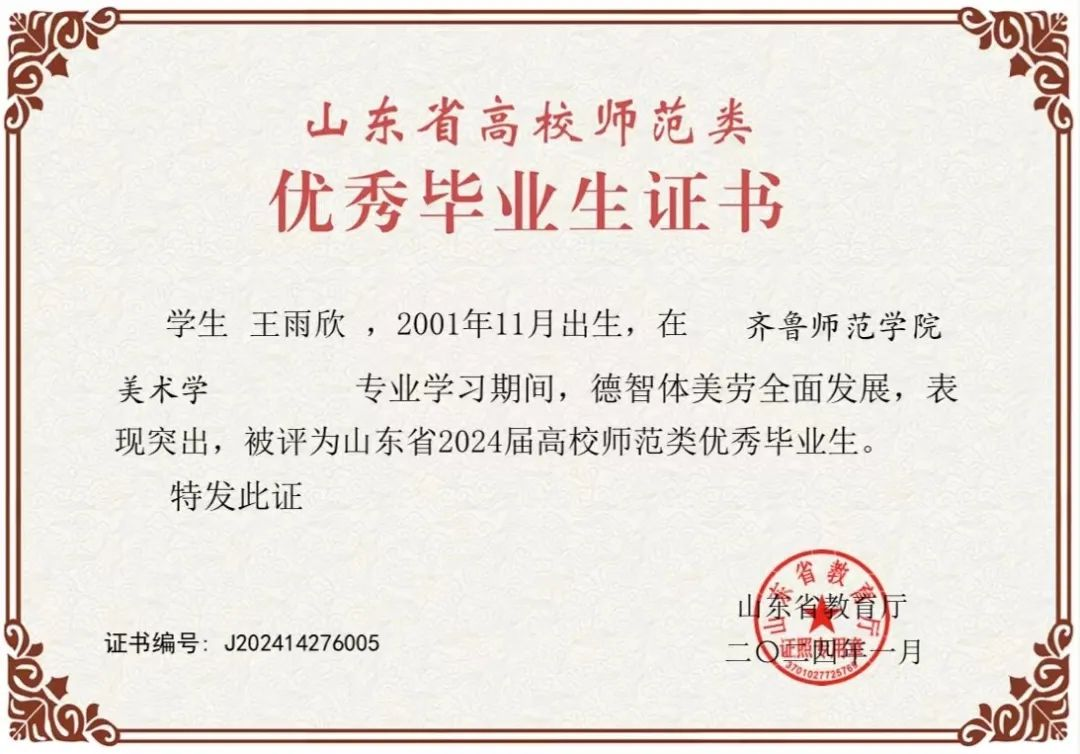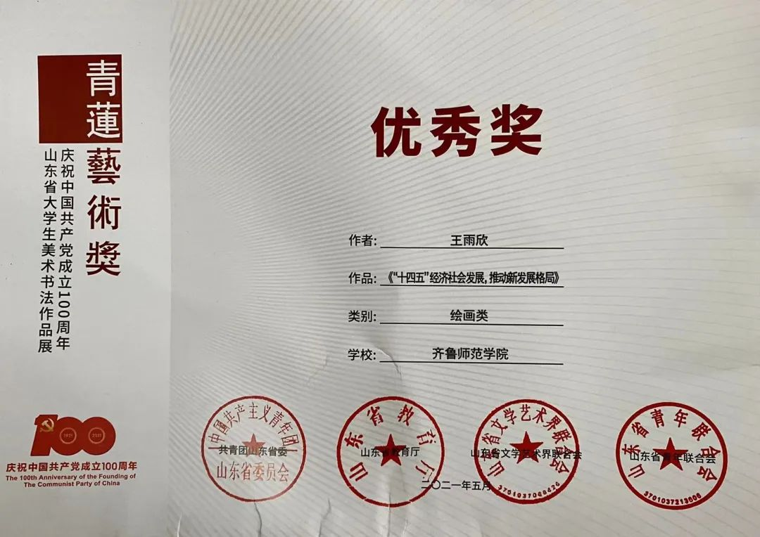 王雨欣,2020级美术学油画班学生,中共预备党员。在校期间曾获山东省优秀毕业生、校级一等奖学金、齐鲁师范学院“五四先进个人”称号、山东省青年美术家协会会员证书、山东省青年联合会“青莲艺术奖”绘画类优秀奖。现已考入济南大学美术与书法专业。她说,追风赶月莫停留,平芜尽处是春山。