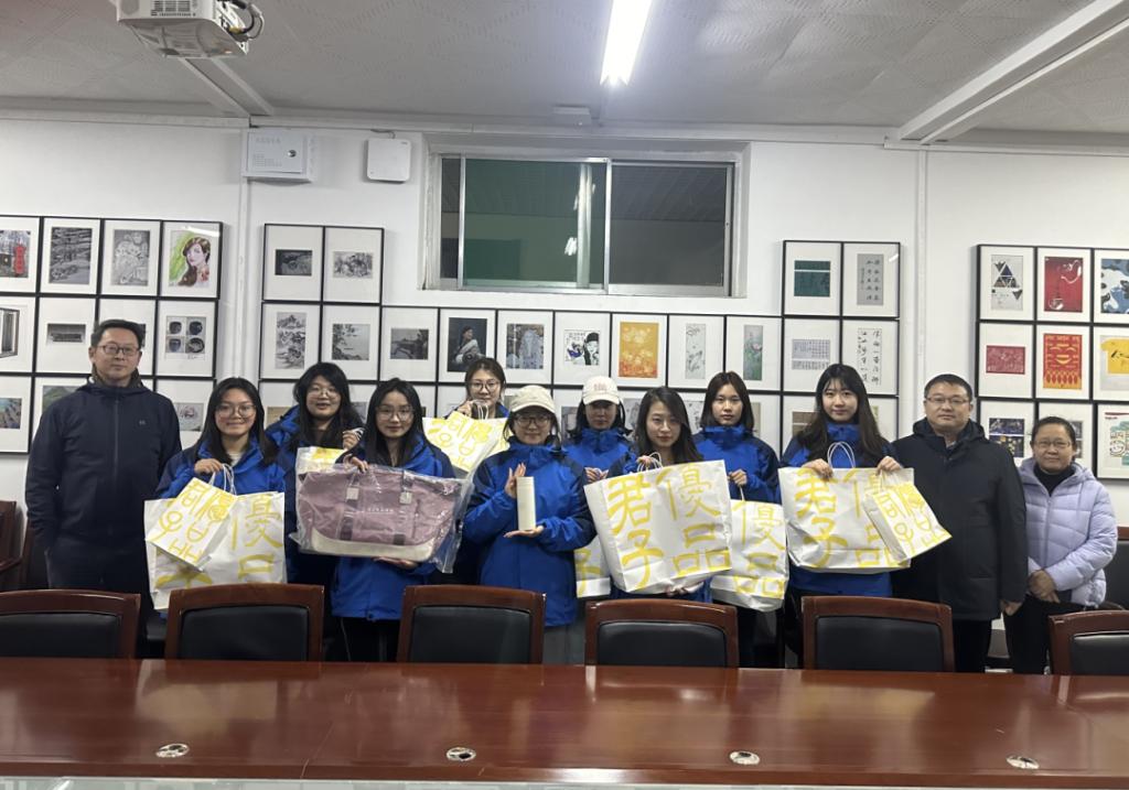 会后,与会领导、教师与支教团学生在教学楼前合影留念,并赠送美术学院爱心礼包“君子文化”文创产品