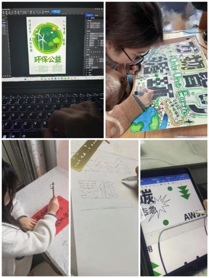 “咫尺青绿”社会实践队在济南市历城区鲁商凤凰城社区通过走访形式开展了调查分析,明确了环保主题的设计方向。实践队在创意工作室运用发散思维进行创意设计,完成了环保标语的设计任务。随后,实践队在社区内征求意见,进行内部评审和外部反馈,筛选出优秀作品。在创意工作室运用集中思维定稿与制作,完成了标语制作任务。最后,实践队在社区进行采访式推广总结,宣传环保理念。