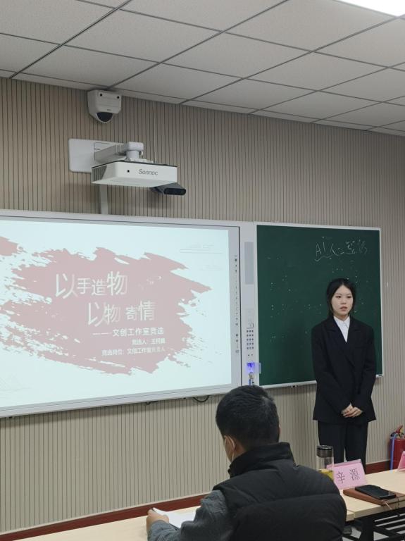会上,辛源讲述了“君子文化”文创工作的过程和现有成果。本次活动中进行了文创工作室主要负责人竞选,各位竞选人各显风采,通过ppt展示了他们对文创的见解。竞选结束进行评议后,辛源当场宣布“君子文化”文创学生工作室成员设置名单。