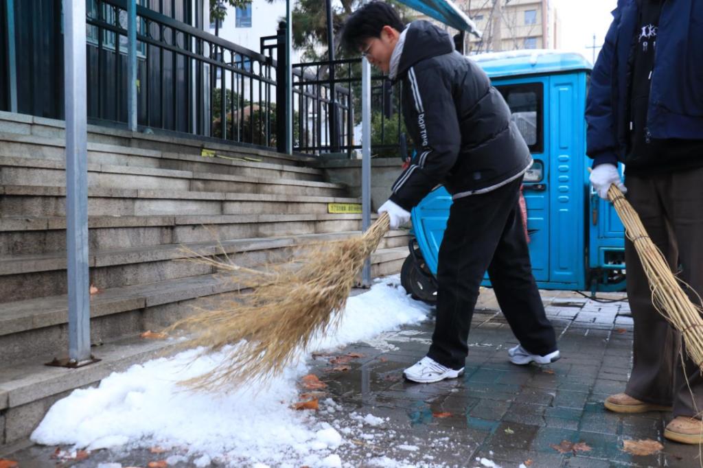 志愿者们对校附近的盲道进行除雪,大家不畏严寒积极行动,手拿扫帚、扒斗、雪铲,用力铲除人行道上的积雪积冰,大家一刻也不停歇,干劲十足。经过几个小时的“奋战”,道路上的积雪明显减少了,扫出了一条“安全”路,让大家的出行更加便利。