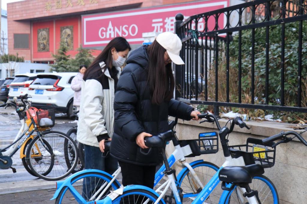 志愿者们特别注意盲道上的单车的清理工作,为人们的通行清理了障碍,大家明确分工,有除雪的,有将单车搬到停放指定位置的,大家十分团结,配合默契,完成了校园附近有段距离的通道。