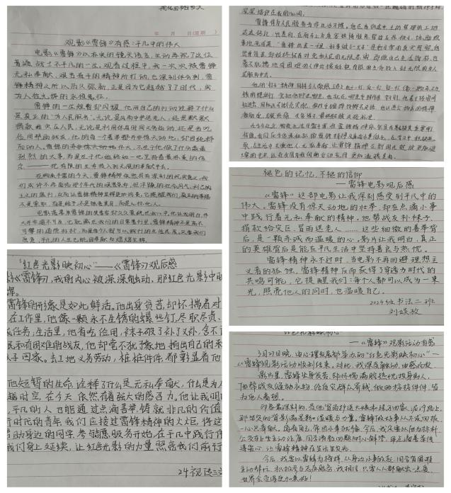 在电影中,同学们看到了送关怀温暖战友,帮战友学文化的雷锋,工作敬业奉献,义务劳动服务群众,雨中护送旅客的雷锋。每一个情节都展现了雷锋的奉献和牺牲精神,诠释了雷锋精神的传承。