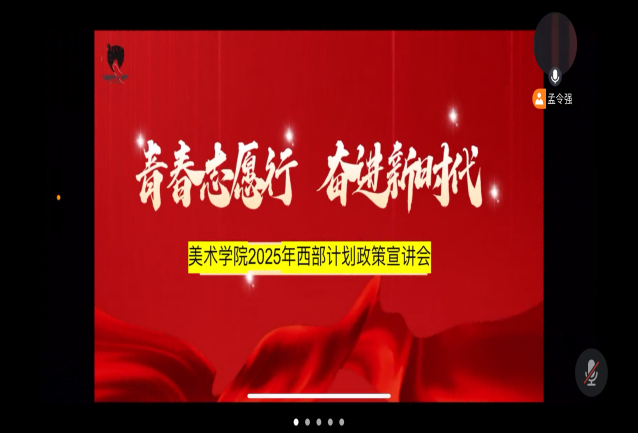 为积极响应国家号召,鼓励更多青年投身西部建设,美术学院于4月2日在线上举办2025年西部计划政策宣讲会。本次会议由毕业班辅导员孟令强主讲,毕业班辅导员李玉涛、刘婷及毕业班学生参加会议。