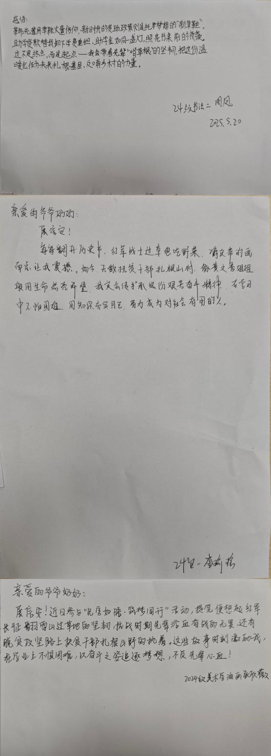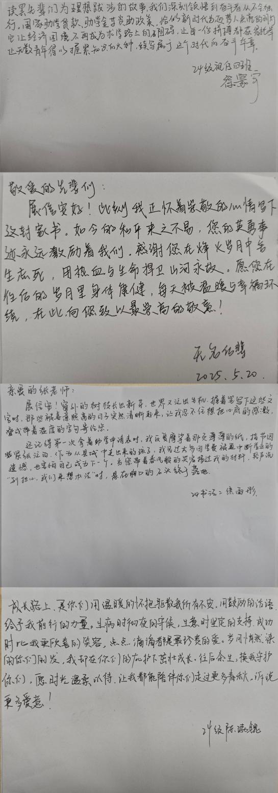同学们积极响应,热情参与,通过家书的形式,传递了革命历史中的红色故事,展现了艰苦奋斗的精神风貌。每一封家书都饱含着深情与敬意,仿佛穿越到了那个战火纷飞的年代,感受到了革命先辈的英勇与坚韧。这些家书不仅体现了同学们的文学才华,更彰显了他们的爱国情怀与奋斗动力。家庭经济困难的同学结合国家助学贷款、助学金等资助政策,撰写了深刻的感悟。这些感悟不仅表达了对革命先辈的敬仰之情,更体现了对新时代奋斗者的支持与鼓励。在520的日子里,同学们还给自己最爱的人写了家书,传递了爱与关怀。这些家书成为了连接亲情、友情、爱情的桥梁,让爱在阳光下绽放。