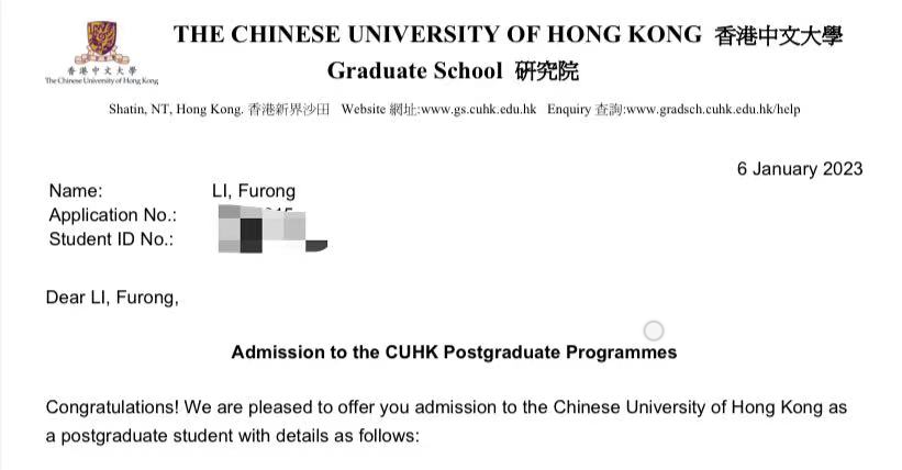 谈及院校选择,栗富荣始终坚定内心的选择,无畏周遭反对的声音,她从不认为自己是平庸的,始终相信自我,乘风破浪,勇往直前。为了得到理想院校的offer,栗富荣秉持着“每天都要努力、每天都要学有所成”的态度,充分利用课上及课外时间,不断提升知识水平,夯实基础,寻求突破。利用外语笔试面试参考书籍、网课等资源,扩大知识面,提高考试技巧。当时她得知竞争对手大多是211、985的学生,为了最大限度地提高自己的竞争力,她更加勤奋刻苦,在备考的同时,她始终保持入学以来各学期综合测评、专业成绩均为专业第一的成绩。最终通过综合成绩、面试的充分表现,成功与211、985的同学走进同一间教室,拿到世界排名QS38的香港中文大学研究生Offer。
