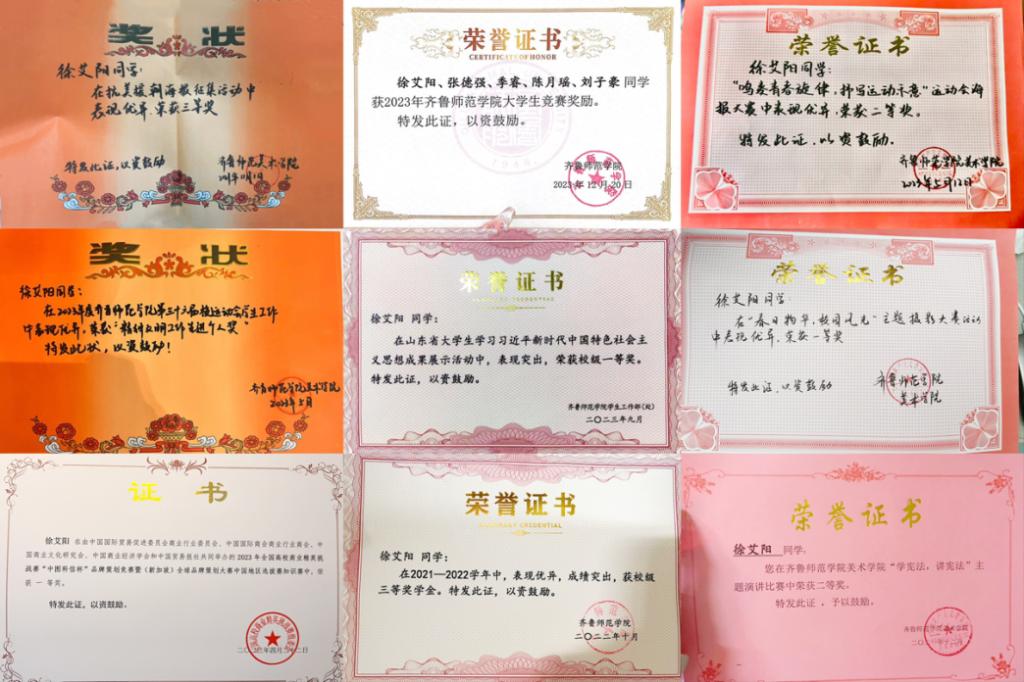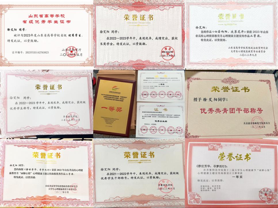 在校期间获得,2023年5月获2023年全国高校商业精英挑战赛“中图科信杯”品牌策划竞赛全国总决赛暨(新加坡)全球品牌策划大赛中国地区选拔赛一等奖;2023年8月2日获品牌策划师专业能力证;2024年6月获2024年全国高校商业精英挑战赛“中图科信杯”品牌策划竞赛全国总决赛暨(新加坡)全球品牌策划大赛中国地区选拔赛三等奖;2022年10月作品《静世芳华,寻梦而行》获2022 年山东省高校心理健康教育月“画解心情”心理健康主题宣传海报优秀作品三等奖;2023年4月获全国高校商业精英排战赛2023年全国高校商业精英挑战赛“中图科信杯”品牌策划竞赛暨|新加坡)全球品牌策划大赛山东省总决赛一等奖;2023年9月获2023年山东省高校心理健康教育月心理健康主题宣传作品二等奖;2024年5月获全国高校商业精英排战赛2024年全国高校商业精英挑战赛“中图科信杯”品牌策划竞赛暨|新加坡)全球品牌策划大赛山东省总决赛一等奖;2022年6月作品《静世芳华,寻梦而行》获齐鲁师范学院第十二届心理健康节“画解心情”心理健康主题宣传海报设计大赛一等奖;2023年7月12日获齐鲁师范学院山东省大学生学习习近平新时代中国特色社会主义思想成果展示活动一等奖;2023年7月获齐鲁师范学院“心向阳光,君自坦荡”为主题的心理健康主题宣传作品二等奖;2023年11月获齐鲁师范学院校长奖学金;2023年12月获齐鲁师范学院第五届职业规划大赛暨首届山东省大学生职业规划大赛金奖;2024年5月《“研”路相伴,温暖助航》获2023年度“我为同学做实事”实践活动十佳优秀案例;2022年10月在2021—2022学年中获得校级优秀学生干部称号;2023年5月获齐鲁师范学院优秀共青团干部称号;2022年10月在2021—2022学年中获得三等奖学金;2023年6月10日视频类作品《运动集结号》获齐鲁师范学院“和谐校园·运动风采”摄影大赛二等奖;2024年5月获齐鲁师范学院优秀共青团干部称号;2022年12月16日获得济南市职业技能线上培训合格证书茶艺师职业;2023年5月作品《你我共同努力 终结结核流行》在济南市第二届结核病防治科普视频征集评选活动中获三等奖;2021年11月参加历下区志愿者服务;2022年3月参加社区核酸检测志愿服务;2021年11月1日获得抗美援朝海报三等奖;2021年11月27日获得心理委员MOOC培训合格证;2021年12月获“学宪法,讲宪法”主题演讲比赛二等奖;2022年4月获“春日物华,校园风光”摄影大赛一等奖;2022年8月获齐山东省大中专学生志愿者暑期“三下乡社会实践活动优秀志愿者;2022年11月10日获“喜迎二十大、对花式诈骗说不”海报大赛一等奖;2023年4月获“学二十大精神,打卡红色地标"摄影大赛二等奖;2023年5月8日获得中共济南市历下区委东关街道志愿服务证;2023年5日12日获齐鲁师范学院美术学院“鸣奏青春旋律,抒写运动示意”运动会海报大赛中荣获二等奖 ;2023年5月获齐鲁师范学院美术学院第三十六届精神文明工作先进个人奖