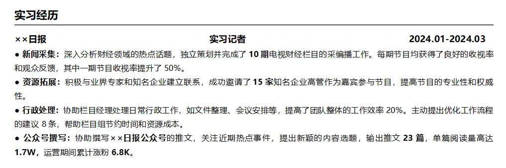 建议尽量不要写自己在某种工作中收获了什么、学到了什么,而是多写自己做了什么、做出了什么成果,尤其是列举有明确数据的成果,比如 “写过多少篇文档、给公司项目带来了多少的收入增长” 等,将更能体现自己的能力和价值。